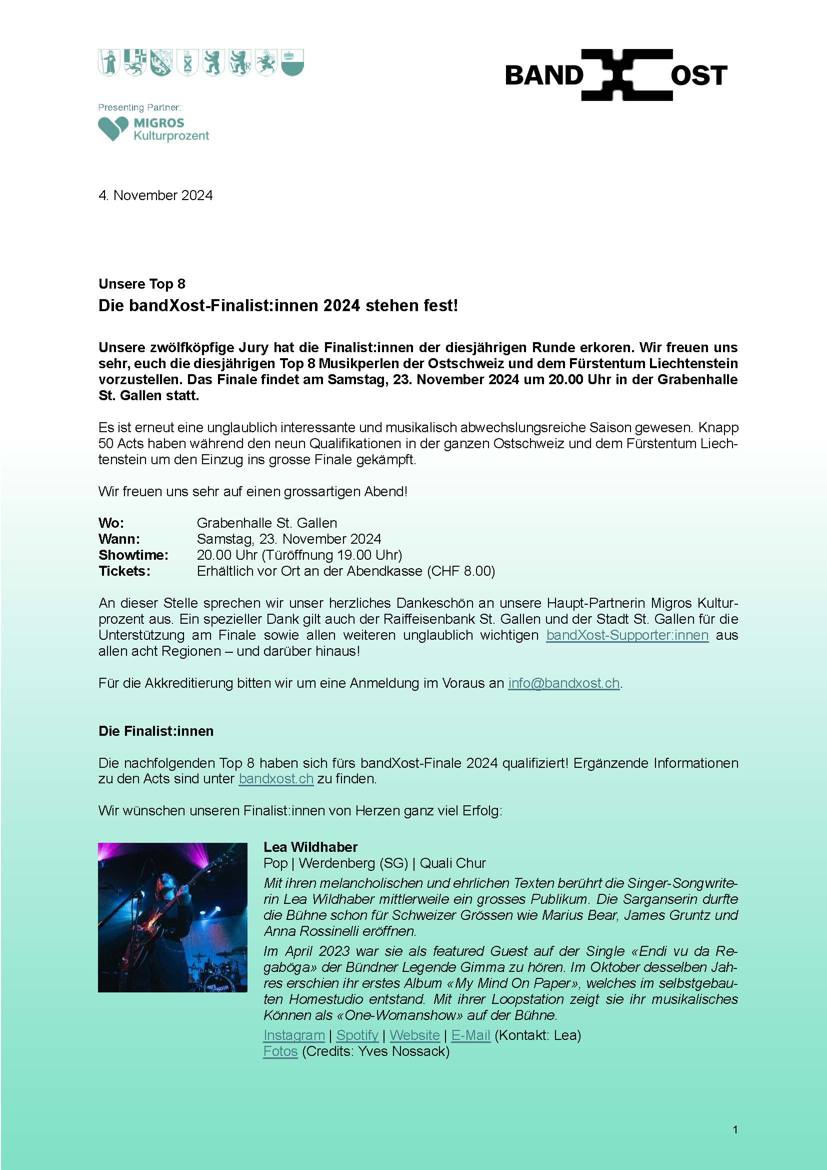 Jedes Jahr erneut sucht bandXost die neuen Musikperlen der Ostschweiz und des Fürstentum Liechtensteins. Im Jahr 2024 fand dieser Contest bereits zum 19. Mal statt, wobei knapp 50 Acts und Bands um den Einzug ins grosse Finale in der Grabenhalle in St. Gallen sowie grosse Preise kämpften. Dabei durfte ich als Social Media Betreuerin und bei der Pressearbeit mitwirken und somit die letztjährigen Gewinner:innen sowie diesjährigen Newcomer:innen ein Stück weit begleiten.